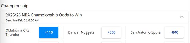 根据最新夺冠赔率,最被看好的前三支球队依次是雷霆、掘金和马刺,全部来自西部,其中雷霆的赔率断层领先。