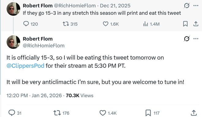 开局快船陷入困境时,一名网友曾公开表示如果本赛季快船任何阶段打出15胜3负表现,自己将打印这条推文并吃掉。
