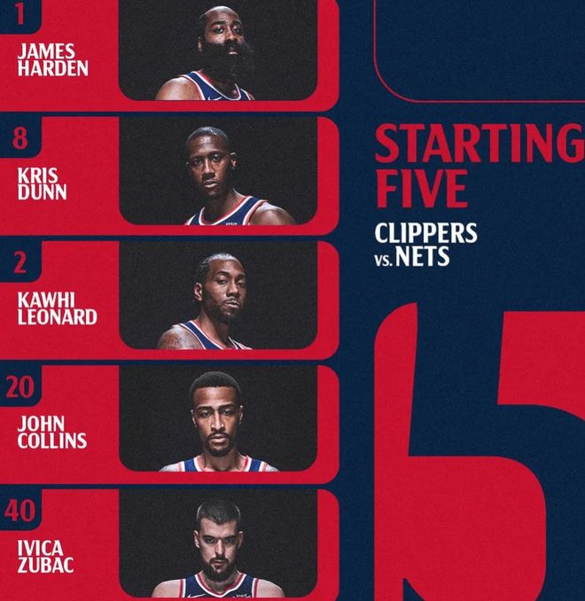 首发阵容方面,快船队这边, 伦纳德继续带伤出战,教练排出的最新首发五人组为:詹姆斯-哈登、克里斯-邓恩、科怀-伦纳德、约翰-科林斯、伊维察-祖巴茨;篮网队这边,海史密斯和卡梅伦·托马斯缺席,首发阵容则为:叶戈尔-杰明、德雷克-鲍威尔、特伦斯-曼、迈克尔-波特、尼古拉斯-克拉克斯顿。