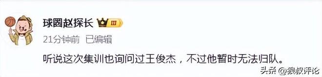 赛后,媒体人赵探长发文:听说这次集训也询问过王俊杰,不过他暂时无法归队。