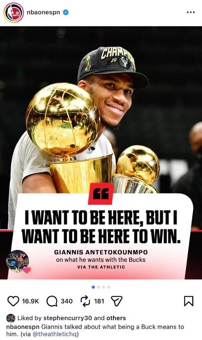 字母哥通过社媒回应留队:“传奇人物从不追逐他人,他们自带吸引力。”