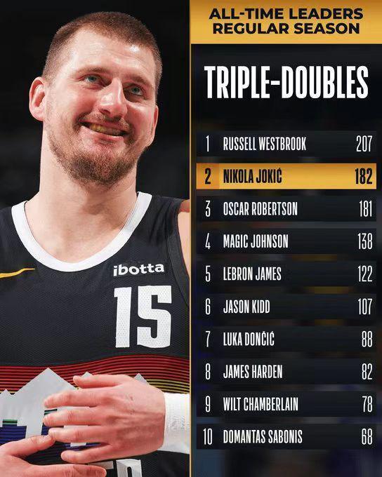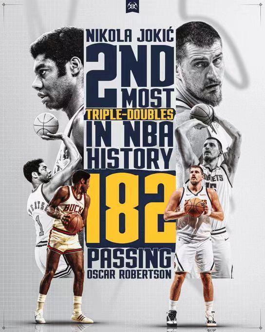 约基奇达成生涯常规赛第182次三双,正式超越大O奥斯卡-罗伯特森181次三双独占历史第二,仅次于前队友威少207次三双。