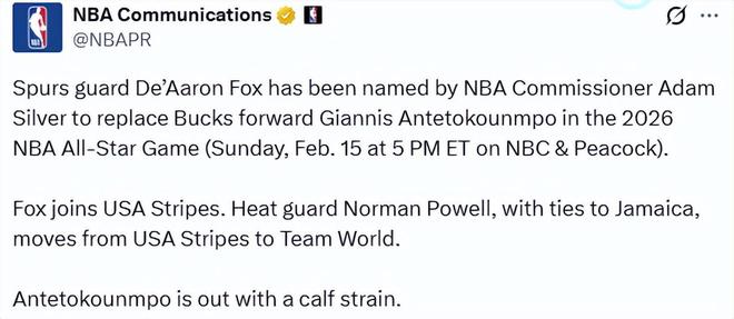 联盟官方宣布,马刺后卫德阿隆-福克斯被总裁亚当-萧华选为替补人选,但他不会加入世界队,而是代表美国条纹队出战;热火球员诺曼-鲍威尔将被调整至世界队,他与牙买加有渊源。