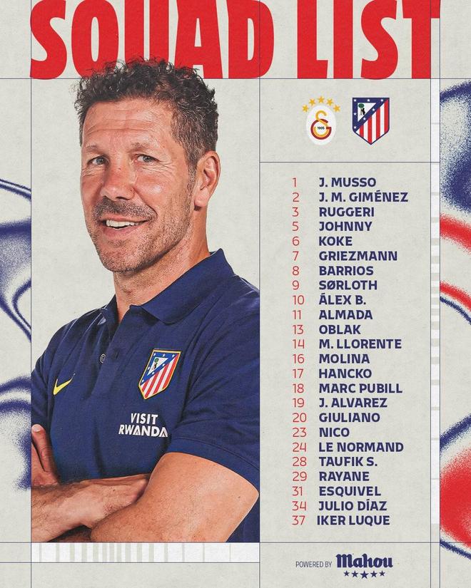 马竞官方公布了欧冠客战加拉塔萨雷的大名单,阿尔瓦雷斯领衔,冈萨雷斯、科克回归。