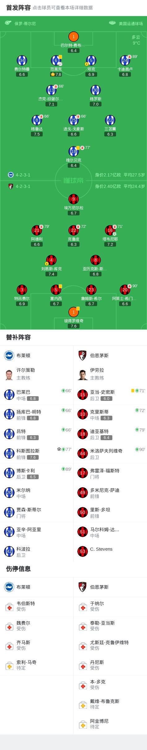 布莱顿1-1伯恩茅斯,科斯图拉斯倒钩绝平,塔韦尼耶点射