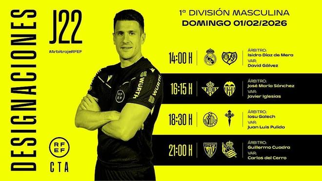 西班牙足协官方公布了周日西甲四场比赛的裁判安排,迪亚斯-德梅拉将执法皇马vs巴列卡诺。