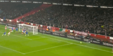 第34分钟,萨利巴后场长传,马丁内利高速前插,禁区内转身打门,被古斯托回追封堵。