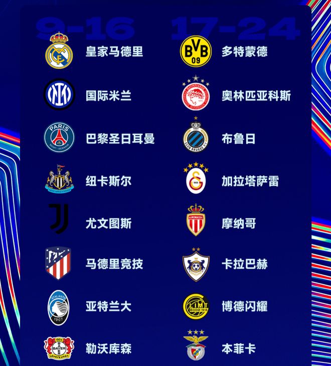 北京时间1月29日,欧冠联赛阶段8轮争夺全部结束。16支参加附加赛的球队全部确定,分别是:皇马、国际米兰、巴黎圣日耳曼、纽卡斯尔、尤文图斯、马竞、亚特兰大、勒沃库森、多特蒙德、奥林匹亚科斯、布鲁日、加拉塔萨雷、摩纳哥、卡拉巴赫、博德闪耀、本菲卡。
