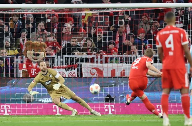 在2025-26赛季德甲第21轮,拜仁慕尼黑主场对阵霍芬海姆。凯恩上半场就独造3球,点球梅开二度之后,凯恩为迪亚斯送出助攻。